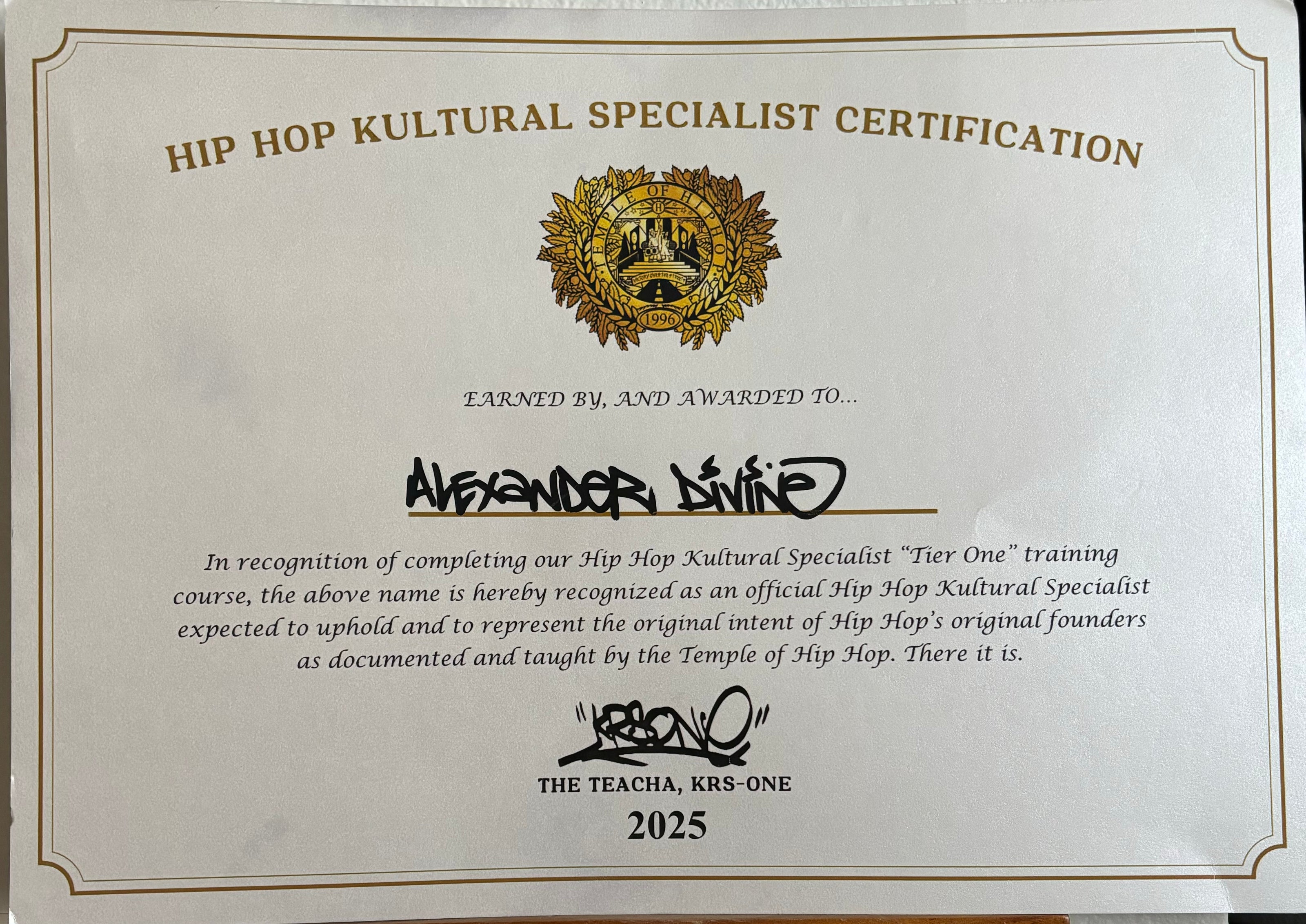 A Teacha in Training and Certified Hip Hop Kultural Specialist, Alexander Divine studies with the first and only Scholarly Institution dedicated solely to the teaching and preservation of True Hip Hop Kulture, under the tutelage of Hip Hop's first Master Teacher KRS-ONE